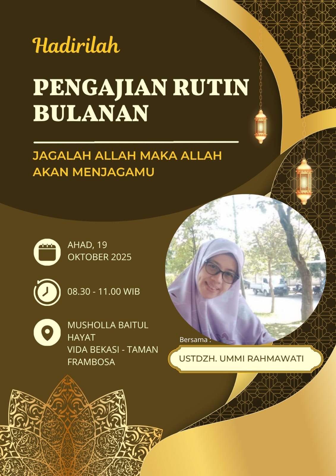 Hari/Tanggal : Ahad, 19 Okt 2025 ⏰ Waktu : 08.30 – 11.00 WIB 📍 Tempat : Musholla Baitul Hayat 🎤 Ustzh. Ummi Rahmawati 💬 Materi : Jagalah Allah Maka Allah Akan Menjagamu